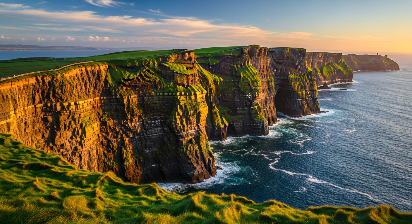 Rising hundreds of meters above the Atlantic Ocean, the Cliffs of Moher offer one of the world's most spectacular coastal views. This UNESCO Global Geopark in County Clare is a testament to the raw power of nature, featuring eight kilometers of sheer rock faces that have stood as a rampart against the ocean for over 300 million years. Visitors are treated to breathtaking panoramas of the Aran Islands, Galway Bay, and the distant Maumturk mountains. Beyond the scenery, the Cliffs are a haven for wildlife enthusiasts and history buffs alike. During the nesting season, the cliffs come alive with thousands of puffins, guillemots, and razorbills. Whether you are walking the paved coastal paths, ascending the historic O'Brien's Tower, or taking a cruise to see the sea stacks from below, the area captures the mythical and rugged spirit of Ireland like nowhere else.